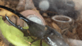 そこで登場したのが、わが家のヒーローヘラクレスオオカブトの太郎ちゃん。オオクワガタの次郎くんとの夢の対決が実現しました。