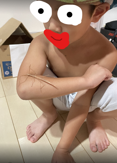 そしてついに、マルちゃんがナナフシを捕まえました。捕獲場所はなんと幼稚園。雑木林はないはずなのに、なぜかそこにナナフシが。子どもの鋭い観察力と情熱が引き寄せたのかもしれません。